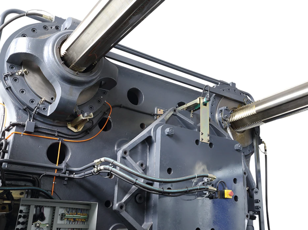 Открытая конструкция с двумя пластинами для фиксации формы использует гидравлическую механическую систему для достижения синхронного тормоза с четырьмя тягами, что повышает эффективность удержания. Новая конструкция фиксации формы в двухплитной машине устраняет недостаток, заключающийся в том, что тяга легко ломается в традиционном режиме двухплитной машины.